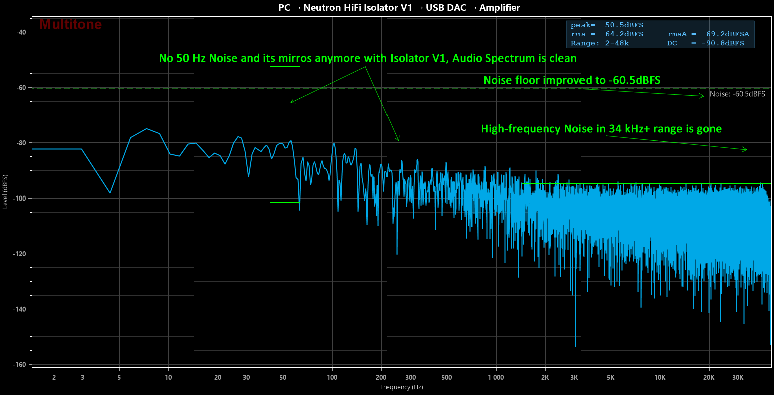 By isolating the ground between the PC and the DAC/DAP, Isolator V1 prevents analog noise — including ground-loop hum — from entering the audio signal, resulting in a cleaner, more accurate audio spectrum.